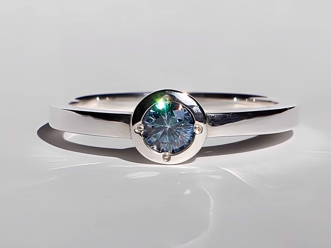 2.5mmのモアサナイトがミル留めさせたソリテールリングです。平打ちアームに施された線彫りがシルクの様な光沢を発します。 This solitaire ring is milled with a 2.5 mm moissanite. The line engraving on the flattened arm gives it a silky sheen. [素材] SILVER925 モアサナイト (ラボグロウン) [規格] 5〜30号 オーダーサイズ リング線径 2.35mm(幅) × 1.5mm (厚み) 程 モアサナイト ラウンドファセットカット 鏡面仕上げでのオーダーも承ります。 〈SHOPPING GUIDE〉 https://raza1.thebase.in/p/00004