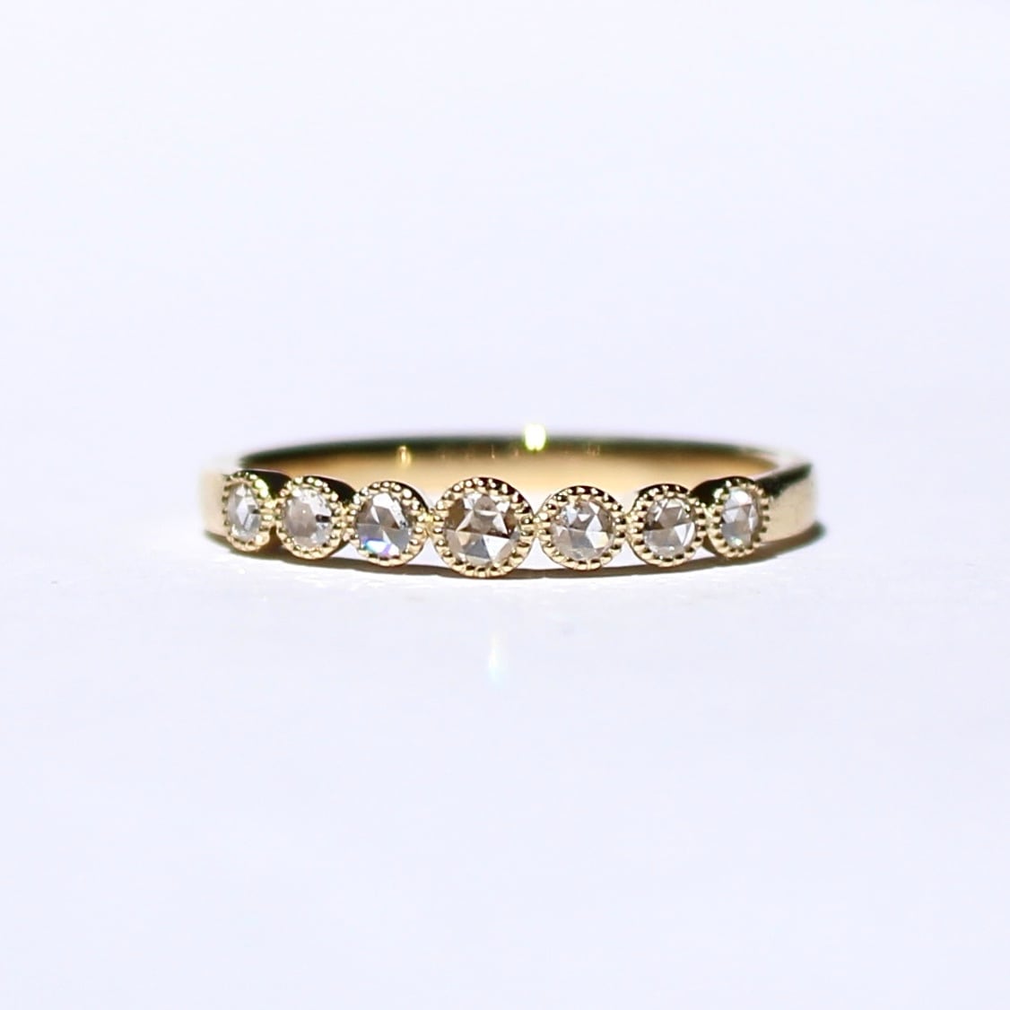 7ピースのローズカットダイヤモンドをミル打ち枠で仕立てました。
